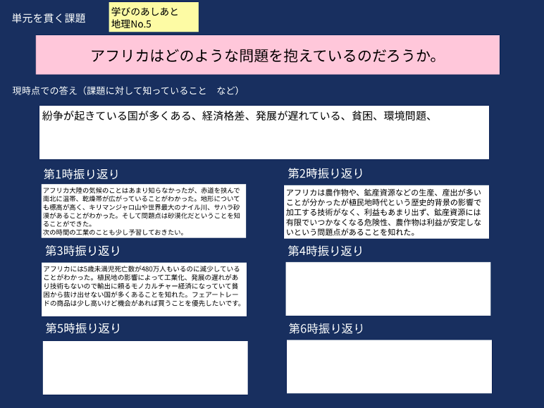 アフリカ州の問題点に着目する単元構成を行った。そのため、単元を貫く課題として、「アフリカ州はどのような課題を抱えているのだろうか」を設定して様々な角度からアフリカ州が抱える問題の原因や状況、解決に向けた取り組みを生徒が考えていく授業を行っていった。中単元ごとにOPPシートの応用である、本校独自の「学びのあしあと」を単元の始めと終わりに書かせ、学習の記録を生徒自身が残していく工夫をしている。